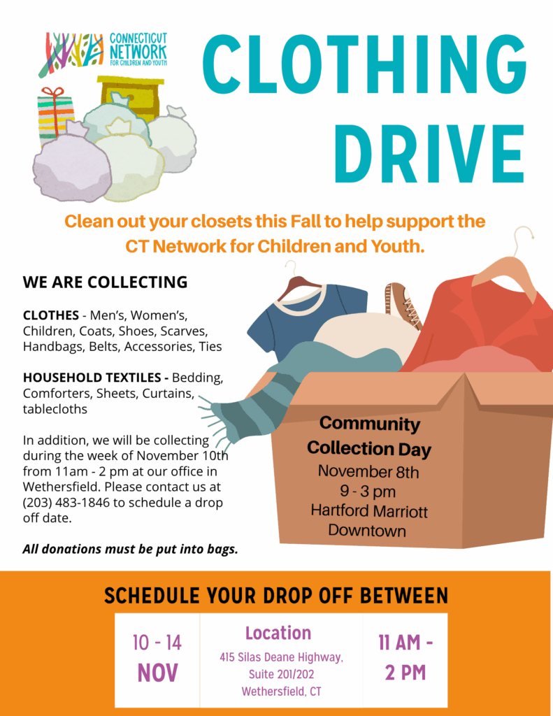 Bring your donations to our Community Collection Day on Sat. Nov 8th or during the week of November 10th from 11am – 2 pm at our office in Wethersfield.